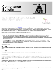 A U.S. Department of Labor final rule increases the salary thresholds used to determine whether executive, administrative, and professional employees are exempt from overtime pay under federal law. While the increased thresholds are likely to result in a significant number of employees who were previously exempt now qualifying for overtime pay, employers also need to consider how the increased thresholds may indirectly affect their benefit offerings. This Compliance Bulletin explains further.